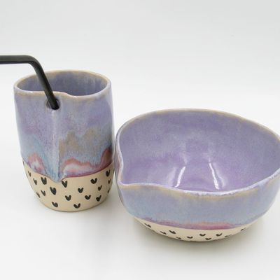 About the glaze: Lavender Dreams is one of my favourite glazes. With lots of lavender with hints of cream, there's also a gorgeous drip over fushia pink at the bottom of the glaze and finished of at the base with hand painted black love hearts. Created using a combination of three different glazes to get this effect, it'll give you heart a little skip of joy every time you see it.
