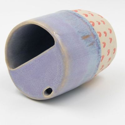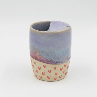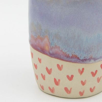 About the glaze: Lavender Dreams is one of my favourite glazes. With lots of lavender with hints of cream, there's also a gorgeous drip over fushia pink at the bottom of the glaze and finished of at the base with hand painted black love hearts. Created using a combination of three different glazes to get this effect, it'll give you heart a little skip of joy every time you see it.